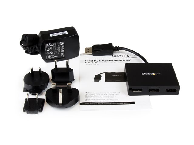 This MST hub lets you connect three monitors to your DisplayPort (DP) 1.2 equipped Windows laptop or desktop. The newest generations of computers are more portable than ever, which often means that you're left with fewer video outputs and smaller integrated screens. This MST hub solves both of these problems by letting you connect three additional displays to your computer, which makes multitasking much easier. With the MST hub, you can use DisplayPort video adapters and cable adapters that enable you to connect HDMI, VGA or DVI displays. This ensures your MST hub will be compatible with virtually any television, monitor or projector. This MST hub is VESA and DisplayPort certified to support DP 1.2 enabled systems, for seamless integration with your existing video equipment. Using the MST hub, you can extend your desktop onto additional monitors and stream independent content to each display giving you the freedom to multitask and increase your productivity. You can also mirror the same image onto multiple displays for remote viewing applications such as digital signage. MST technology uses your existing video card to minimize the use of system resources while delivering Ultra HD 4K resolutions. This unprecedented performance makes MST perfect for high-resolution applications such as graphic design, gaming and medical imaging. Note: When using a DisplayPort 1.1 video card the MSTDP123DP will act as splitter, automatically mirroring your video source across all displays. Resolution limitations apply. Note: MST shares 21.6 Gbps across all attached displays. Higher resolutions can restrict the available bandwidth with the remaining ports. Certain graphics adapters have limited MST support and will only output to three displays in total. If more than three monitors are attached the fourth will be disabled.