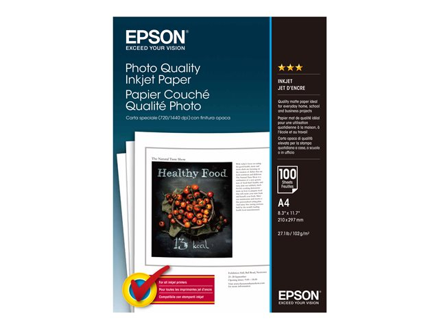 - Information Hög utskriftskvalitet När du behöver imponera är våra enkelsidiga, matta, vita , Photo Quality Inkjet Paper med 102 g/m2 den perfekta lösningen. Det har utformats för att hantera rikt detaljerade och färgstarka högupplösta bilder, samtidigt som det även framställer skarp och tydlig text. Du kan lita på att den framställer exceptionella rapporter, kursmaterial, certifikat med mera. Optimerade för Epson-skrivare Epsons bläck och papper har utvecklats för att ge optimalt resultat när de används tillsammans med Epson-skrivare. Fantastiskt för alla skrivare Våra papper framställer fantastiska resultat med andra tillverkares skrivare och bläck, vilket gör att alla kan dra nytta av Epsons expertis.