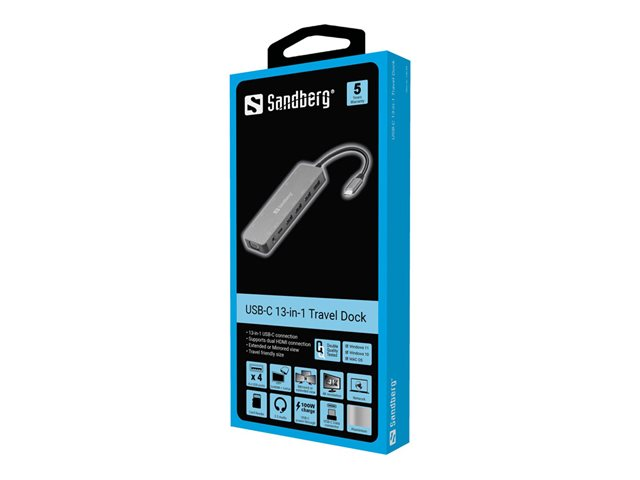 With just one USB-C connection to your laptop Sandberg USB-C 13-in-1 Travel Dock gives you the possibility of connecting all your gear.