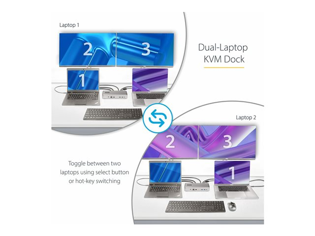 - KVM-docka för dubbla laptops: Anslut/växla mellan 2 datorer på skrivbordet och dela 2 x 4K 60 Hz-skärmar, tangentbord, mus och annan USB-kringutrustning; växla mellan två laptops med en växlingsknapp på framsidan av dockan