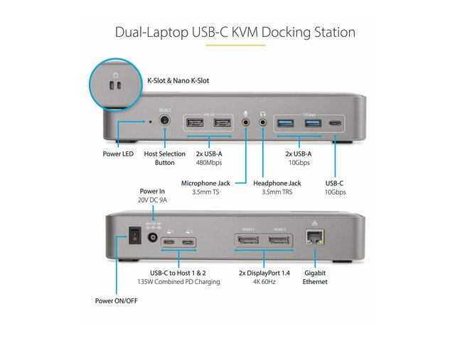 StarTech.com Dual-Laptop USB-C KVM Docking Station, Dual Monitor 4K 60Hz DisplayPort Dock, 5-Port USB Hub, GbE, 90W/45W Power Delivery to Two Laptops, Windows/Mac, 2-Host KVM Dock