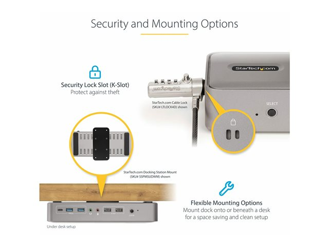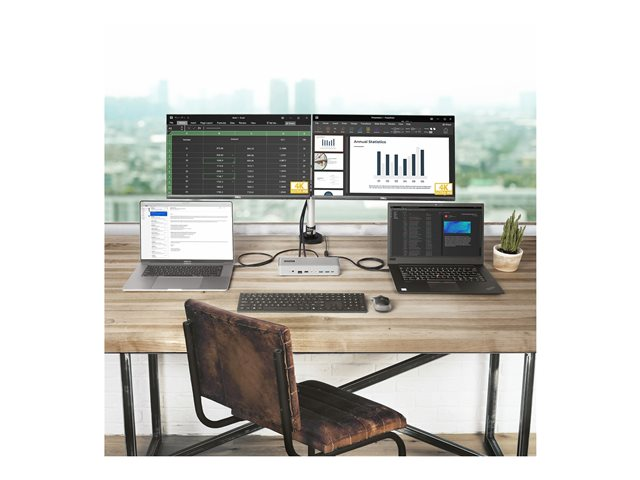 - ANSLUTNING: Dockan har en mängd olika portar för enhetsanslutning; 2x USB 2.0 Typ-A HID/2x USB-A (10Gbps)/USB-C (10Gbps)/2x DisplayPort/2x USB-C/Gigabit Ethernet/audio 3,5mm stereo/micro 3,5mm värdportar/2x K-Slots (Standard/Nano)