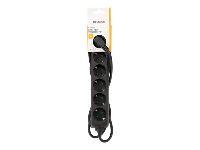 DELTACO Jordat grenuttag, 6x CEE 7/3, 1x CEE 7/7, barnsäker, 5m, svart.
